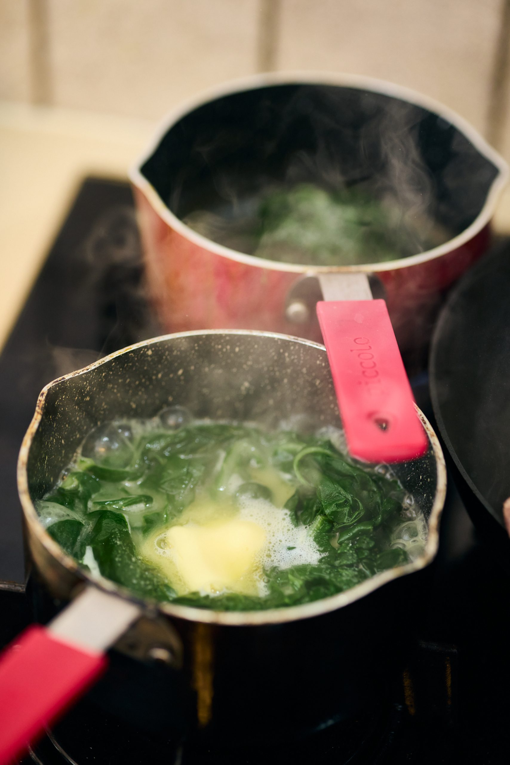 Sautéed chard and spinach with poached eggs and hollandaise sauce.