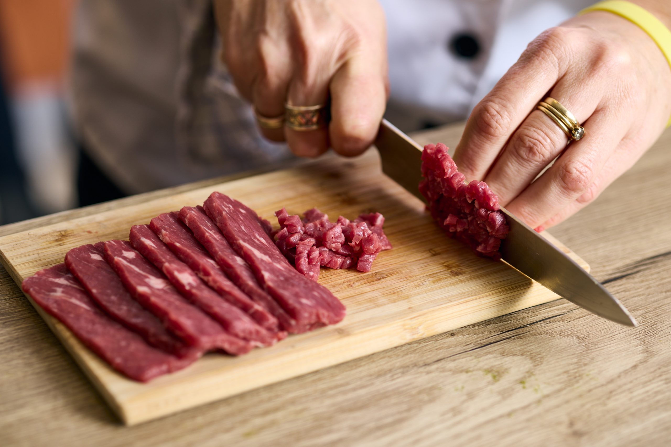 Handmade tartlet with beef tartare, garlic cream and anchovies